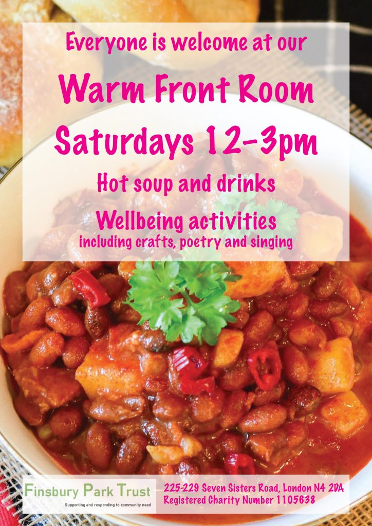 Share this story: Funded by Islington Council we are delighted to open up our Front Room to be a warm space on Saturdays from 12 to 3 until the end of March. We will provide warm soup and hot drinks to those in the area who need it and who want to spend some time […]